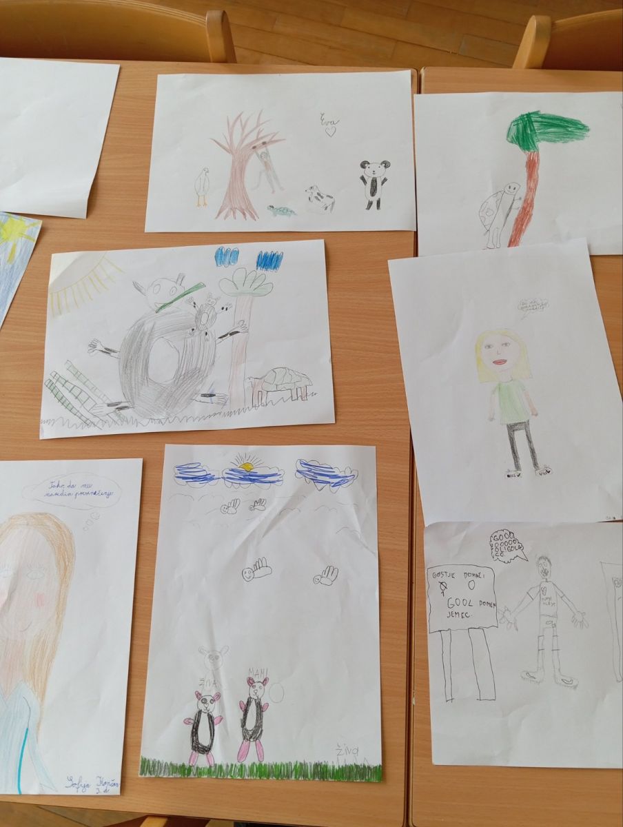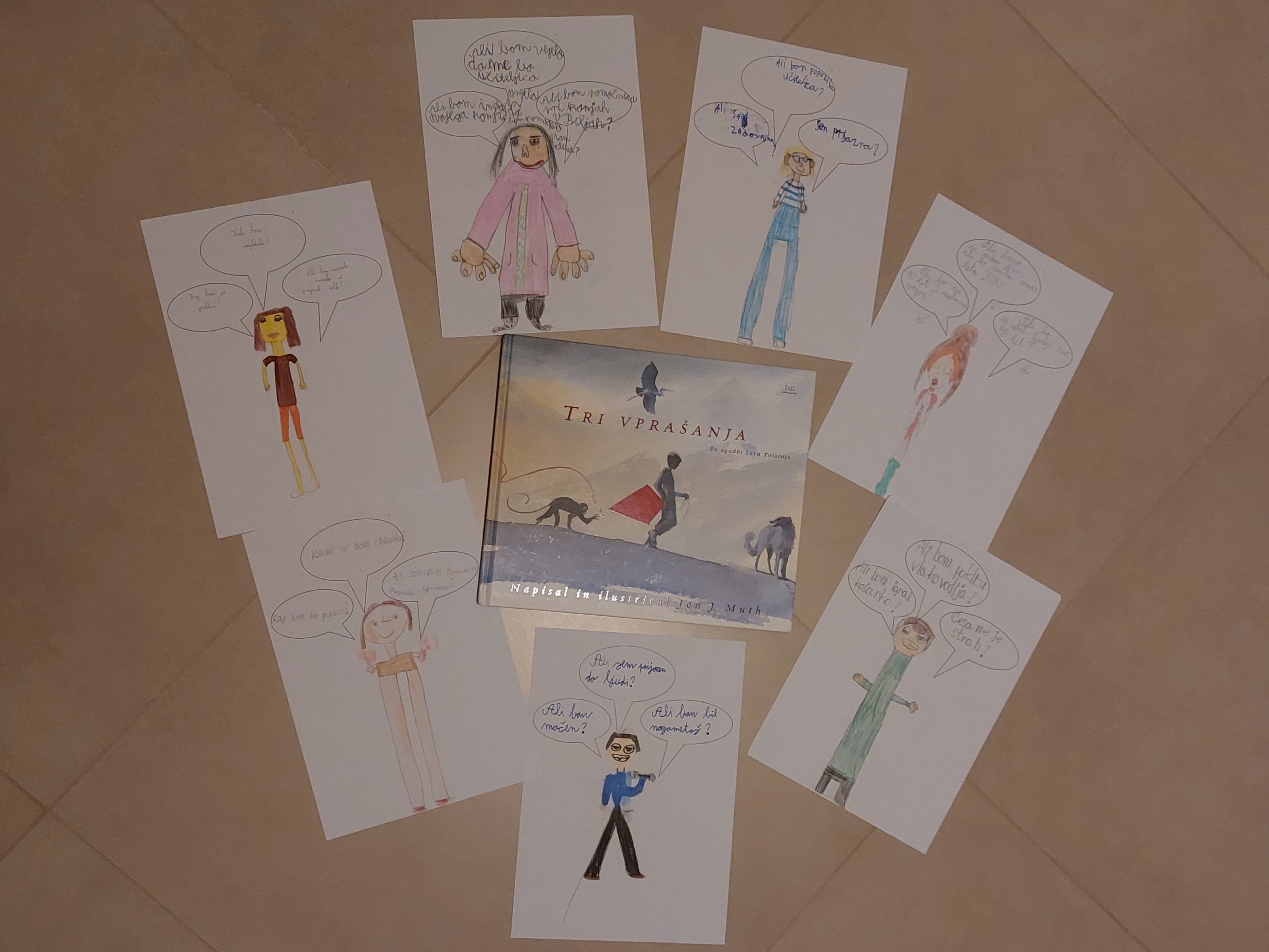 »Ob mednarodnem dnevu knjig in avtorskih pravic smo z 3. d razredom v šolski knjižnici OŠ Preserje Radomlje prebrali pesem Zakaj rada berem? Iz zbirke Tri pike … Barbare Gregorčič Gorenc in knjigo Tri vprašanja avtorja Jona J. Mutha. Gre za slikovito pripoved o dečku Nikolaju, ki želi postati dober človek. Mučijo ga tri pomembna vprašanja: Kdaj je pravi čas za neko dejanje? Kdo je najpomembnejši? Katero dejanje je pravo? Odgovore išče pri modrih živalih – želvi, čaplji, opici in psu – a jih na koncu odkrije skozi izkušnjo pomoči in sočutja. Sporočilo knjige je, da je najpomembnejši trenutek zdaj, najpomembnejša oseba tista, ki je trenutno z nami, in najpravilnejše dejanje je tisto, ki prinaša dobro. Učenci so po branju razmišljali o teh vprašanjih, nato pa svoje odgovore zapisali in tudi narisali. Nastali so zanimivi avtoportreti in risbe nastopajočih živali. S tem so razvijali zmožnost samorefleksije, empatijo in zavedanje o vrednosti dobrih dejanj. Srečanje v knjižnici je bilo poučno, ustvarjalno in navdihujoče,« je zapisala Suzana Stojanović, knjižničarka.
