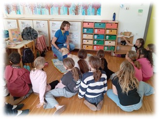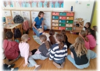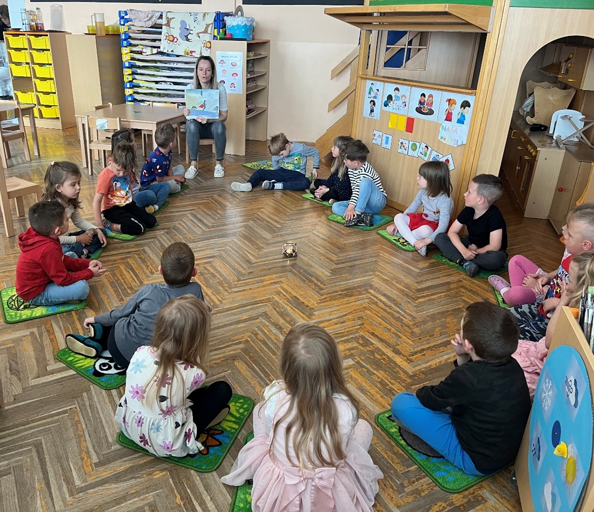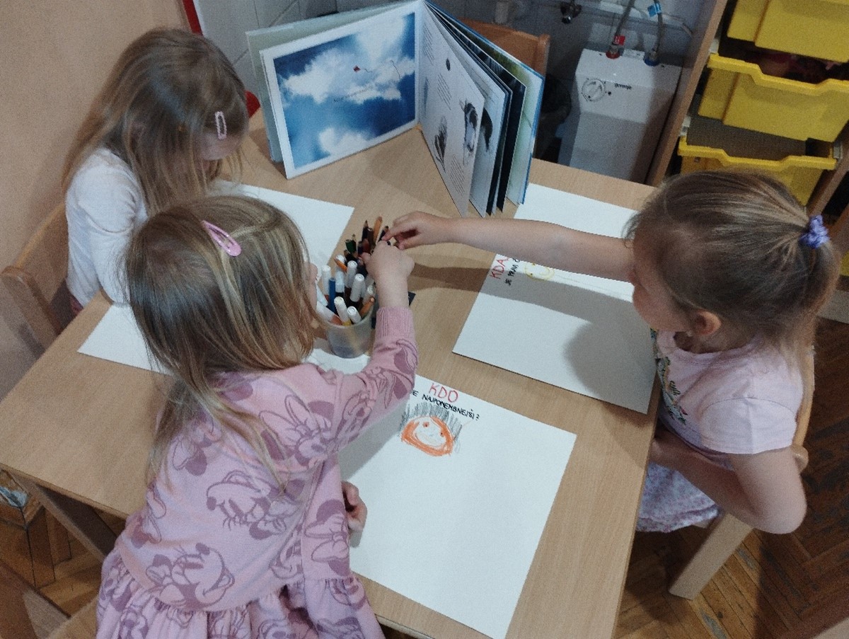 »V Zeleni igralnici smo letošnjo noč knjige obeležili s knjigo z naslovom Tri vprašanja, ki jo je napisal in ilustriral Jon J. Muth. Z branjem smo pričeli v torek, 23. aprila 2025, ko smo v jutranjem krogu prižgali svečko, sedli na blazine in prisluhnili branju. Sprva sva mislili, da otroci ne bodo razumeli bistva knjige, pa vendar so naju zelo presenetili z odgovori. Kako je pomembno, da otrokom omogočimo dejavnosti, za katere včasih dvomimo, da jim bodo uspele in mislimo, da so za njih pretežke, saj nas znajo dobro presenetiti in pokazati, da zmorejo več, ko si lahko mislimo. Po prebrani vsebini sva otrokom zastavili vprašanja: »Kdaj je pravi čas, za neko dejanje?«, »Kdo je najpomembnejši?« in »Katero dejanje je pravo?«. Odgovori so bili različni in zelo zanimivi (Želvak, Nikolaj, pomagati si moramo, biti moramo prijatelji, moja sestrica je najpomembnejša …). Nato smo še enkrat ob ilustracijah knjigo v celoti obnovili in otroci so si jo zelo zapomnili, sama vsebina in ilustracije so jim bile zanimive,« sta zapisali Špela Čeh, vzgojiteljica, in Martina Ornik, pomočnica vzgojiteljice.