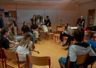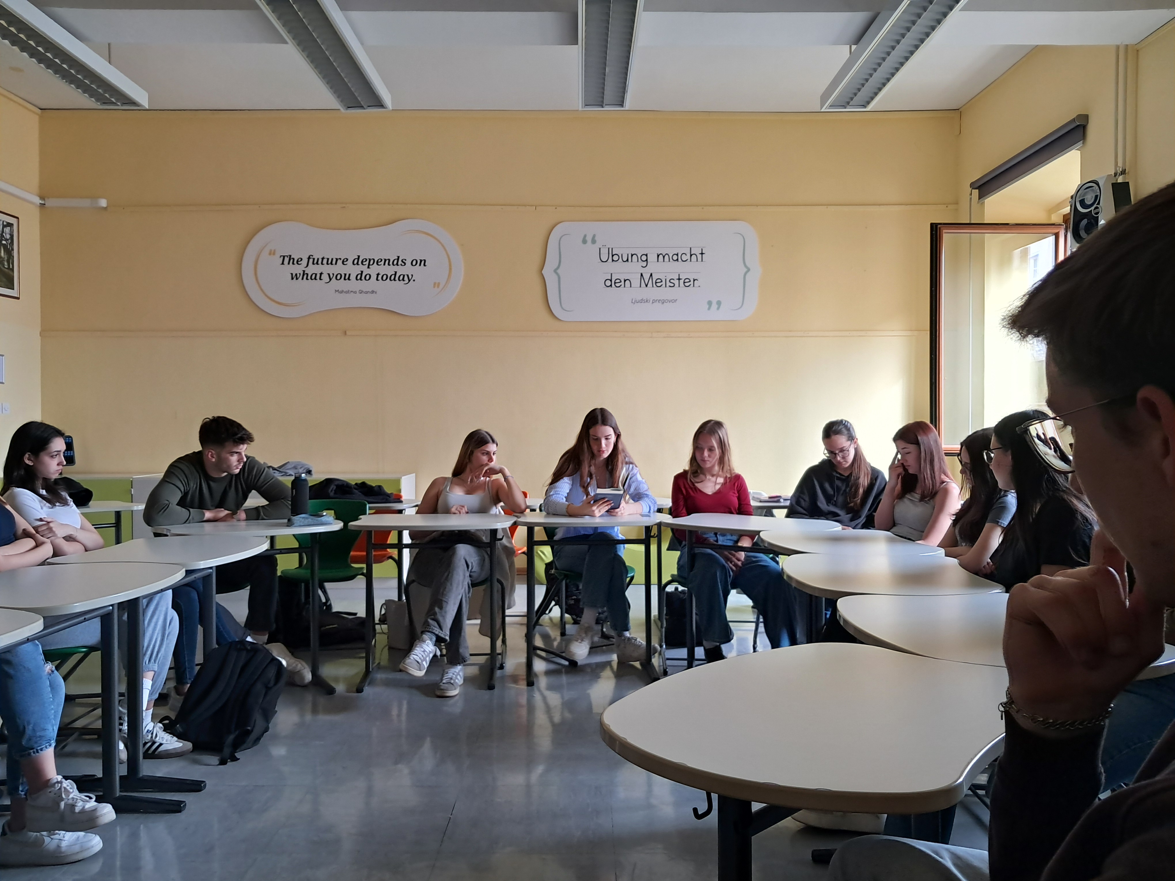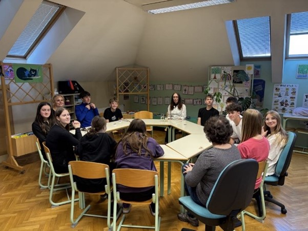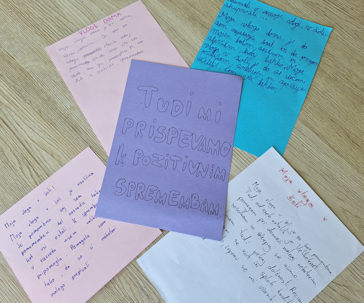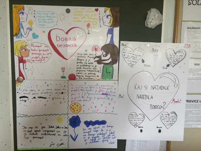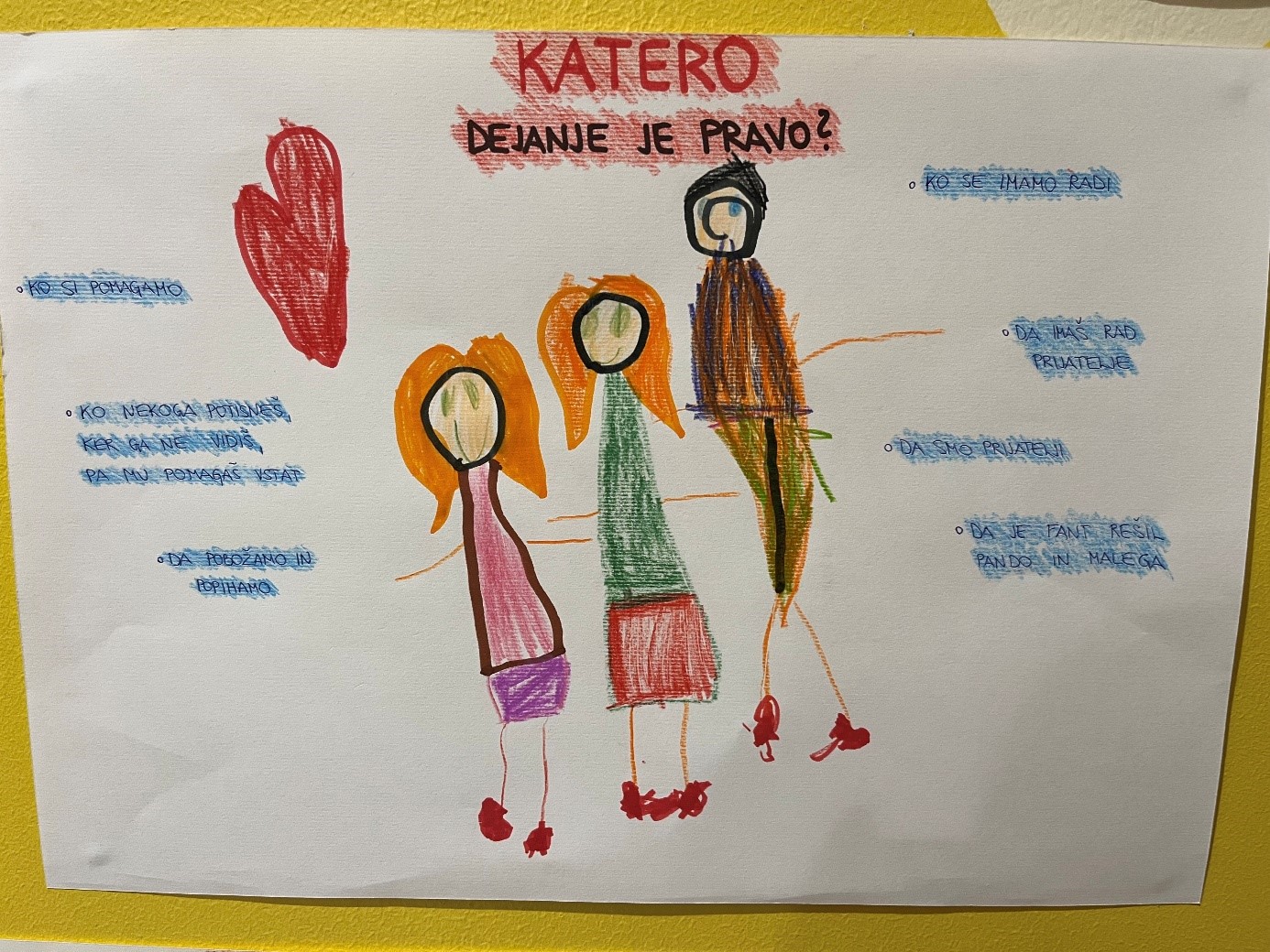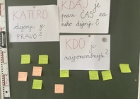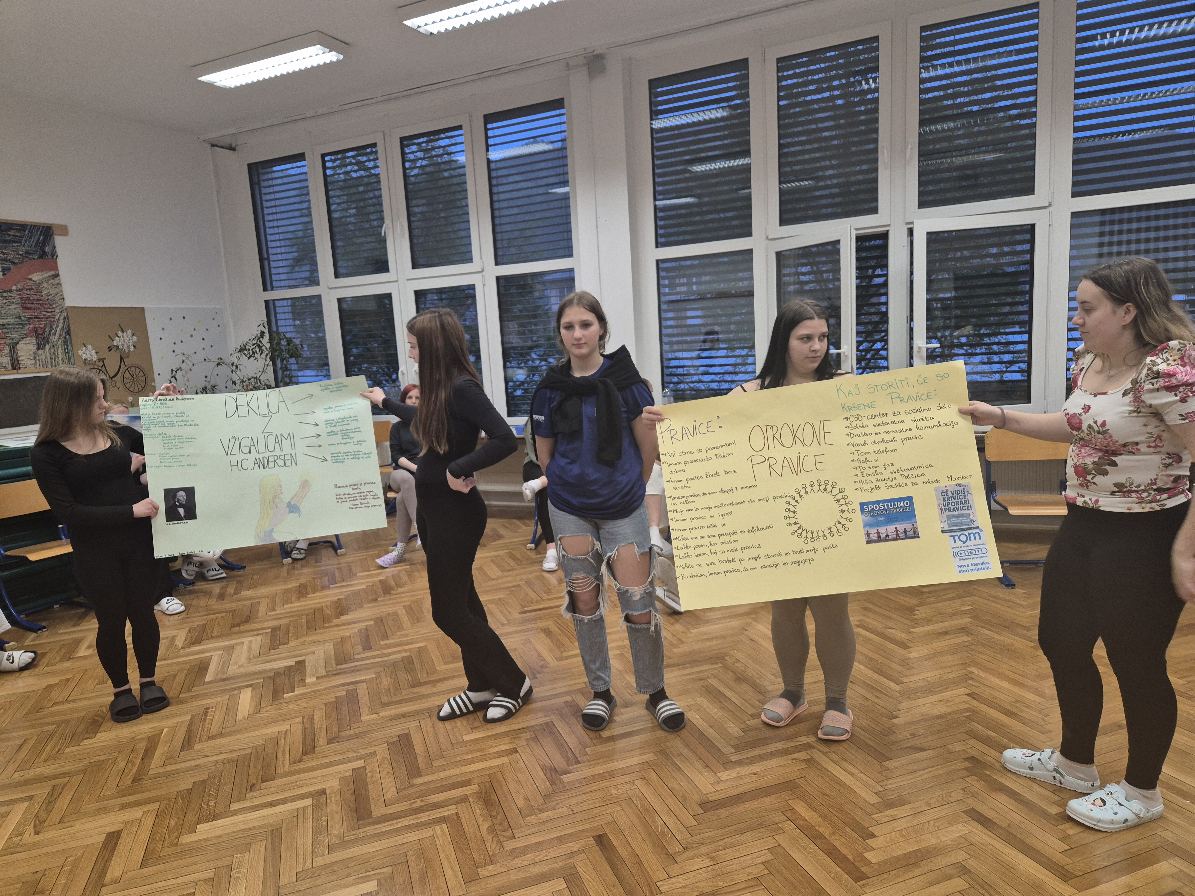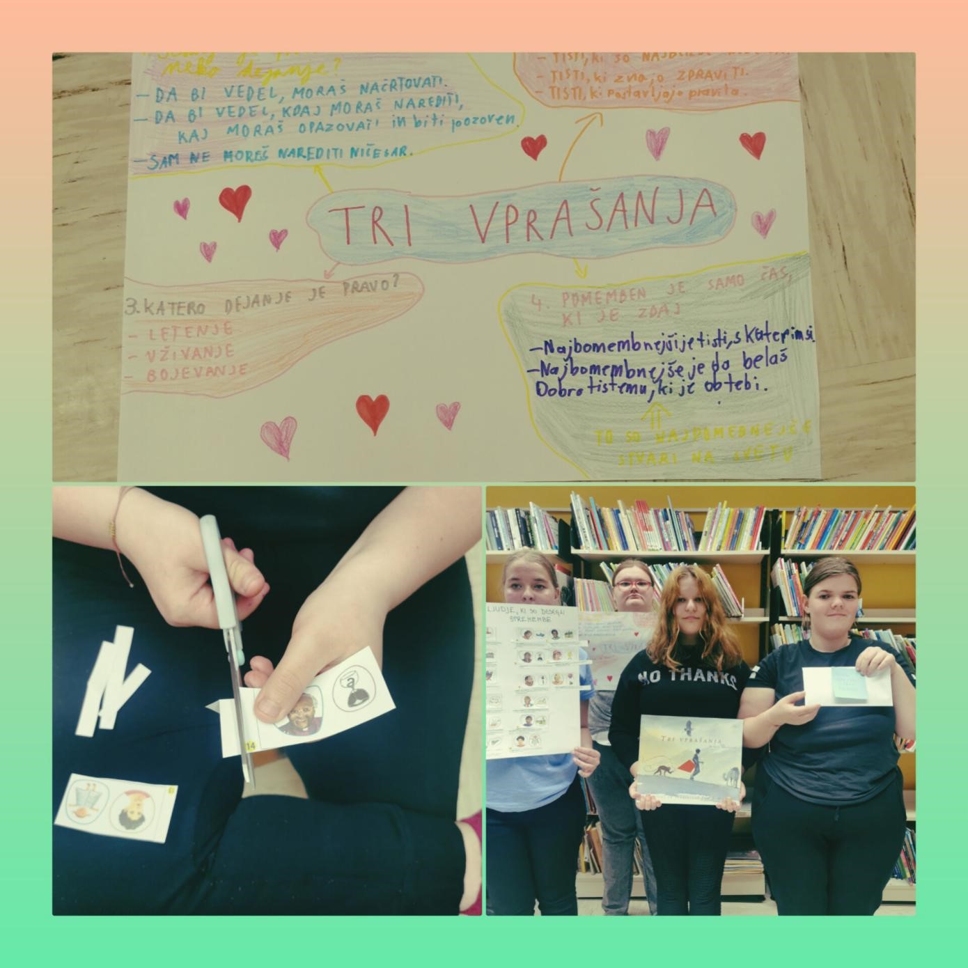 »V četrtek, 24. 4. 2025, smo se v Dijaškem domu Vič zbrali v učilnici na traktu vzgojne skupine 2B. Namesto večerne prisotnosti, ki bi sicer potekala v omenjenem času, smo si privoščili poslušanje in branje Treh vprašanj po zgodbi L. Tolstoja avtorja Jona J. Mutha.Izluščili smo njeno glavno sporočilo, ki govori o tem, da je življenje tukaj in zdaj. Najpomembnejše je, da se zavedamo sedanjega trenutka, skrbimo za ljudi okoli sebe in delamo dobro. Prava modrost ne prihaja iz odgovorov, ampak iz dejanj. Kar nekaj dijakov_inj je izpostavilo, da so bile tudi same kdaj v podobni situaciji. Vsi so izpostavili, da se soočajo z različnimi občutki. Dijaki_nje so razmislile_i o svoji vlogi doma, v šoli, v dijaškem domu in širši skupnosti. Ugotovitve smo zbrali na listkih, ki smo jih s pomočjo fasilitacije zbrali in naknadno pretvorili v digitalni plakat. Slikanica Tri vprašanja je kljub svoji preprostosti zelo aktualna tudi za naše mladostnike in se močno povezuje z vrednotami človekovih pravic,« je med drugim zapisala mentorica projekta Maruša Gajić.