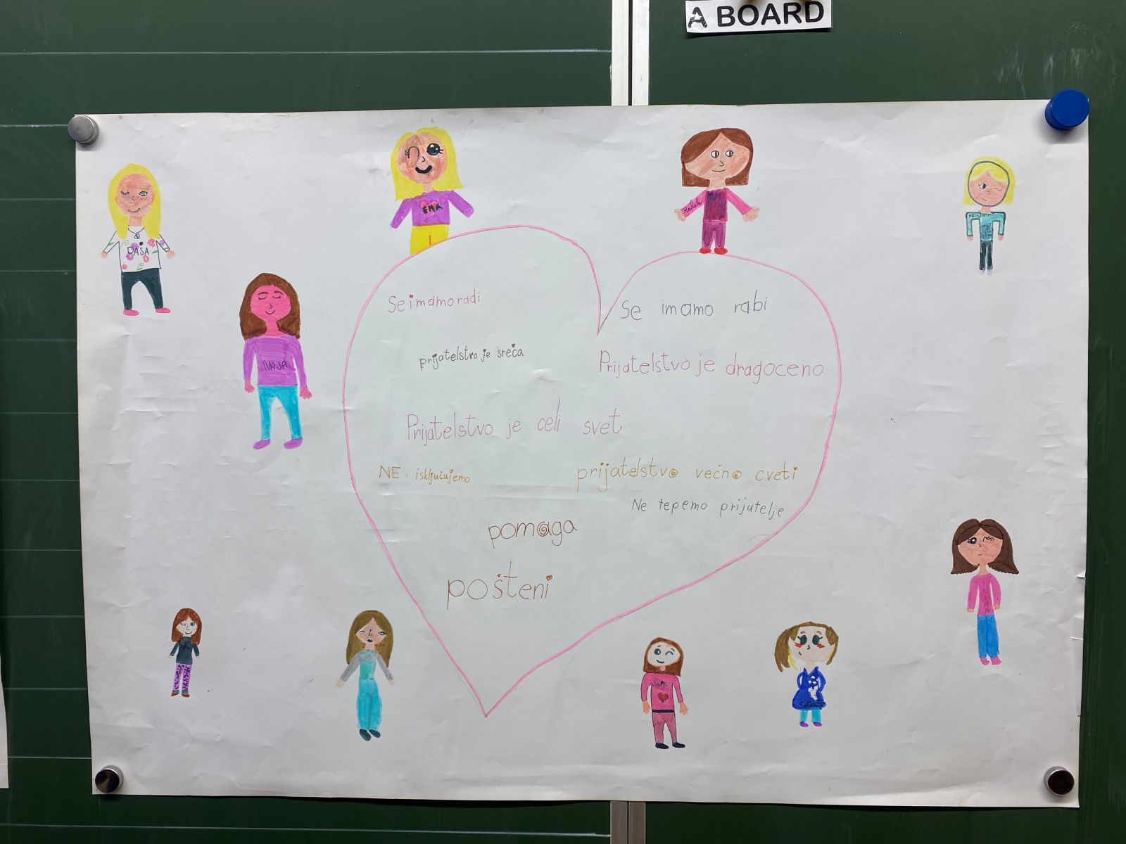 »Po končanem branju knjige Tri vprašanja smo se z učenci pogovorili o prijateljstvu in nastal je spodnji plakat. Učenke so plakat izdelale popolnoma samostojno. Nad projektom so bili učenci zelo navdušeni, izbrana tema je bila zanimiva in primerna. Z veseljem se bomo projekta udeležili tudi naslednje leto,« je zapisala mentorica Tina Rajko.