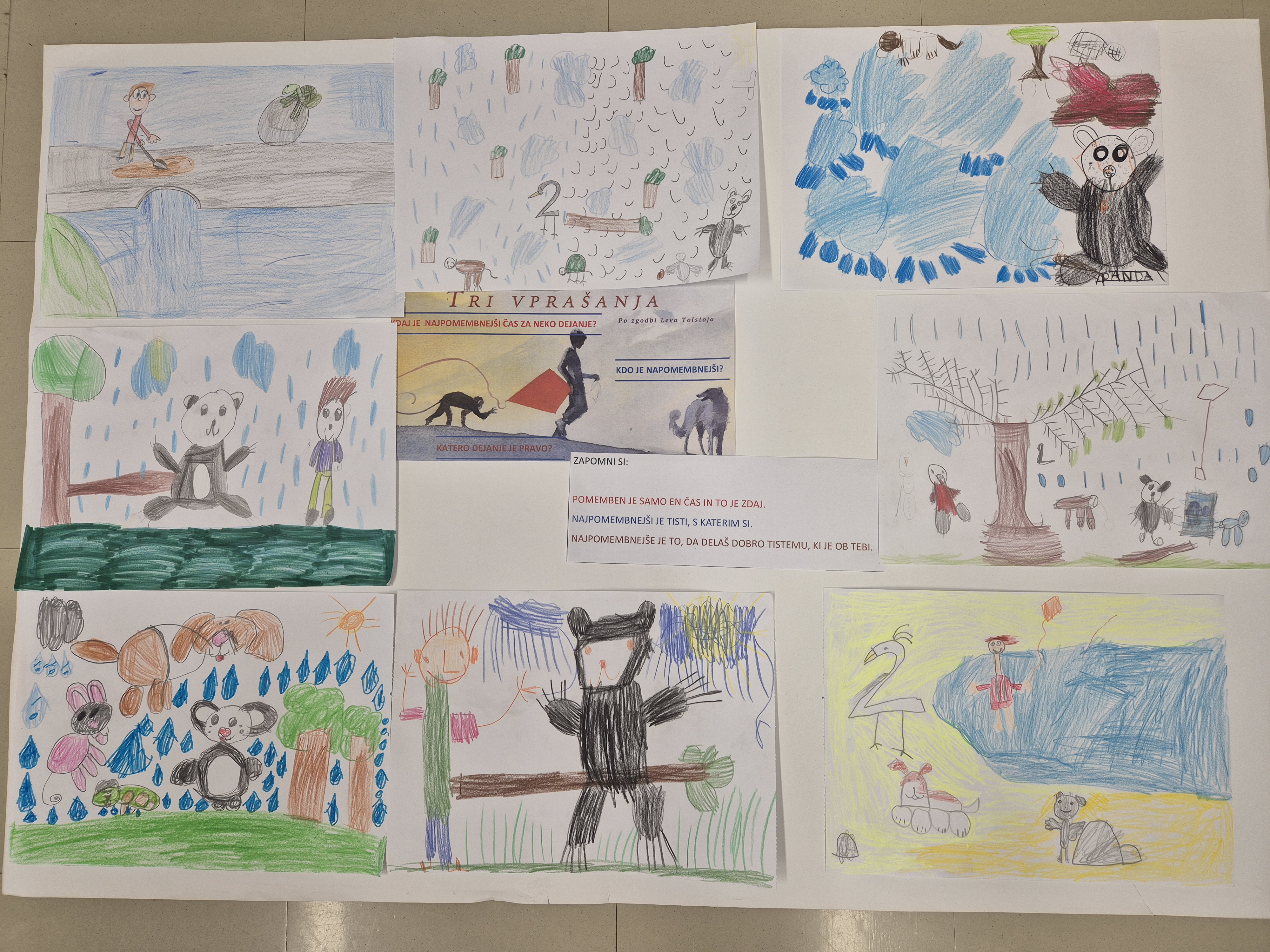 »Ob letošnji Noči knjige smo prejeli prav posebno darilo – čudovito slikanico Tri vprašanja, ki nam jo je podarila organizacija Amnesty International Slovenija. Knjiga nas spodbuja k sočutju in življenju v trenutku, kar je čudovito sporočilo za mlade bralce. Slikanica temelji na zgodbi Leva Tolstoja in raziskuje globoka življenjska vprašanja: Kdaj je pravi čas za neko dejanje? Kdo je najpomembnejši? Katero dejanje je pravo? Mladi Nikolaj išče odgovore na ta vprašanja in se obrne na modrega želvaka Leva, a na koncu odgovore najde kar sam, skozi dejanja, odnose in sočutje do drugih. Petošolci so ob branju te navdihujoče zgodbe razmišljali o pomenu našega obstoja, o odnosih in ljudeh, ki nas obkrožajo, o svoji vlogi doma, v šoli, skupnosti, kako lahko sami prispevajo k pozitivni spremembi v življenju druge osebe in napisali pismo samemu sebi, kaj si želijo spremeniti in kako lahko to storijo. Učiteljica Natalija bo pisma skrbno hranila in jim jih vrnila ob zaključku osnovne šole, da bodo lahko vsak zase prepoznali osebno rast in pozitivne sledi, ki nastajajo ob njihovem odraščanju. Naj vam zaupamo, da je najpomembnejša tista oseba, s katero si v tem trenutku in ji posvečaš svojo pozornost. Na ostali dve vprašanji pa lahko odgovora najdete v tej knjigi, ki odpira srce,« je še zapisala Tadeja Ferk, knjižničarka na OŠ Malečnik.