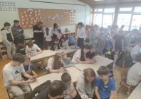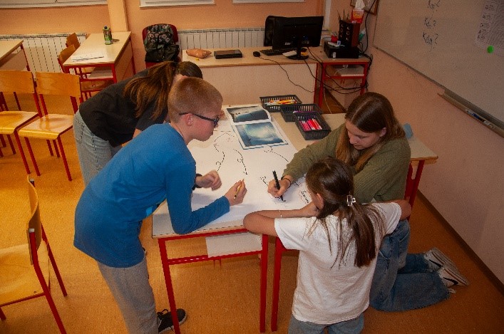 »V petek, 11. 4. 2025 je bila na naši centralni šoli organizirana Noč knjige za prijavljene učence predmetne stopnje. Glede na sestavljen program aktivnosti, smo najprej imeli prihod učencev centralne šole in PŠ Struge, ki so se zbrali v šolski garderobi. S sabo so prinesli najljubšo knjigo, udobna oblačila, spalno vrečo, družabno igro. Na vhodu so jih sprejele učiteljice E. Zajc, B. Blatnik in H. Erčulj. Okoli 17.00 sem jih odpeljala v malo dvorano športne dvorane, kjer nas je že čakal naš gost, ilustrator in pisatelj Uroš Hrovat. Gospod Hrovat je učencem predstavil kako nastane strip. Skozi risanje začetnih potez na listu papirja in pogovor z učenci je nastala zgodba v šestih slikah o Balončku in Tončku. Učenci so bili skozi celotno dejavnost aktivni, dajali so predloge in postavljali vprašanja povezana tako z nastankom stripa, kot tudi s samim delom ilustratorja. Po zaključku druženja z avtorjem, smo se preselili v knjižnico, kjer je vsak učenec predstavil svojo najljubšo knjigo. Presenetili so z raznolikostjo tematik in naborom knjig. Nato smo malce prezračili in porabili odvečno energijo s krajšim tekom. Vrnili smo se v šolo, se okrepčali z večerjo in se družili ob športnih aktivnostih. Pred nadaljevanjem večernih dejavnosti smo se zbrali v razredu, kjer smo dejavnosti nadaljevali tako, da smo prebrali in si ogledali knjigo Tri vprašanja, ki je bila dar Amnesty International, ameriškega avtorja in ilustratorja Jona J. Mutha. Nato smo imeli krajši pogovor o sočutju in življenju v tem trenutku, o tem kaj pozitivnega lahko naredimo oz. spremenimo za nekoga drugega. S knjigo Tri vprašanja smo nadaljevali z začetno tematiko - ilustriranje, ki smo jo nato nadgradili. Najprej smo se razdelili v skupine, ki so imele nekaj minut časa, da si izberejo ime. Dobili smo skupino Grozni Gašper, Smrkci, Peter Pan, Asterix, Obeliks, Franček … Vsako skupino so sestavljali 3 do 4 učenci iz različnih razredov. Nato smo se preizkusili v znanju o pravljicah, svetovnih uspešnicah in v poznavanju naslovov knjig, saj je vsaka skupina morala rešiti učni list. Večer smo nadaljevali tako, da so si skupine naključno izbrale vsaka svojo knjigo. Knjige so si ogledali, jim preučili tematiko in zgradbo, nato pa so s pomočjo dodatnih navodil izpisali odlomek (vsaj 10 povedi) iz knjige. Glavnim junakom odlomka so dodali drugačne karakterne in fizične lastnosti, spremenili okolje in posledično odlomek preoblikovali. Iz preoblikovanega odlomka je vsaka skupina sestavila svojo zgodbo v treh slikah s pomočjo računalniškega programa storyboardthat. Vsaka skupina je pri delu uporabila svoj računalnik, ali v knjižnici ali v računalniški učilnici. Kljub poznem zaključku dejavnosti, je bila le ta zanje zelo zanimiva in poučna, predvsem pa namenjena medgeneracijskem druženju in sodelovanju učencev različnih starosti, ki so skupaj ustvarjali, se pogovarjali, dogovarjali in predvsem učili drug od drugega. Noč knjige smo zaključili naslednje jutro, ko smo imeli zajtrk, pospravili stvari in se odpravili domov,« nam je sporočila Klavdija Kos Fijolič, knjižničarka JVIZ OŠ Toneta in Franceta Kralja Dobrepolje.