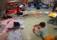 »Že tradicionalno smo na OŠ Toneta Tomšiča nagradili učence, ki so uspešno opravili bralno značko, z nočjo knjige (oz. bralnim kampom). Kar 50 učencev od 2. do 9. razreda se je odločilo, da bo večer in noč s 24. na 25. april preživelo v šoli. Letošnja skupna tema noči branja je bila skupnost, zato smo v našo družbo povabili tabornike roda Snežniški ruševci kot del lokalne skupnosti. Ti so pripravili 4 nadvse zanimive in pestre igre, ki so iz učencev izvabile aktivnost in navdušenje. V nadaljevanju smo se poglobili v knjigo Tri vprašanja ter se spraševali kdaj je pravi čas za neko dejanje, kdo je najpomembnejši in katero dejanje je pravo. Učenci so prisluhnili zgodbi Jona J. Mutha, ki so nam jo darovali iz organizacije Amnesty International. Kot del aktivnosti so se učenci sami poglobili v omenjena vprašanja ter nanje odgovarjali. Po slastni večerji smo se odpravili na krajši nočni pohod do bližnje vasi Bač, nato pa pohiteli nazaj v šolo, saj so vsi komaj čakali na pripravljanje svojih začasnih ležišč. Od medsebojni pomoči so bili učenci kaj kmalu v pižamah ležali v svojih »posteljah«, brali vsak svoji knjigo, se pogovarjali in igrali družabne igre. Nekateri prej, drugi kasneje so našli sanjski svet in mirno zaspali. Zbudili smo se v nov dan, ki je bil hkrati tudi zadnji dan pred začetkom prvomajskih počitnic, zato je bilo zbujanje še slajše,« so zapisale mentorice Tanja Blažek, Alenka Biščak, Katarina Žmak in Martina Batista Jenko.