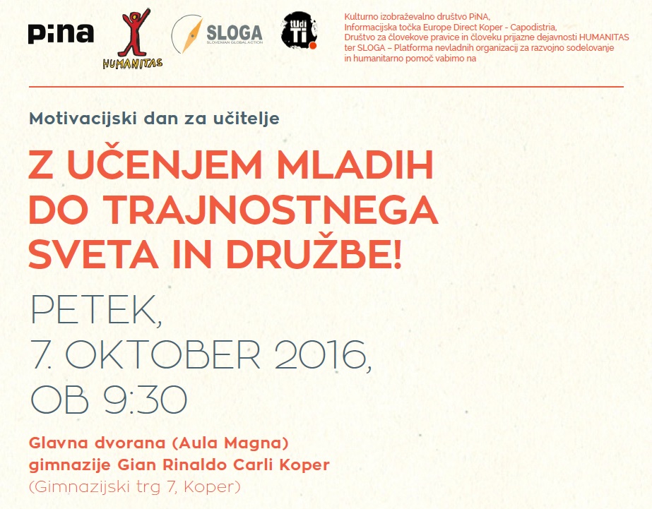 Vabimo vas na motivacijski dan za učitelje Z učenjem mladih do trajnostnega sveta in družbe, ki bo v petek, 7. oktobra 2016, od 9.30, v glavni dvorani (Aula Magna) gimnazije Gian Rinaldo Carli v Kopru (Gimnazijski trg 7, Koper).