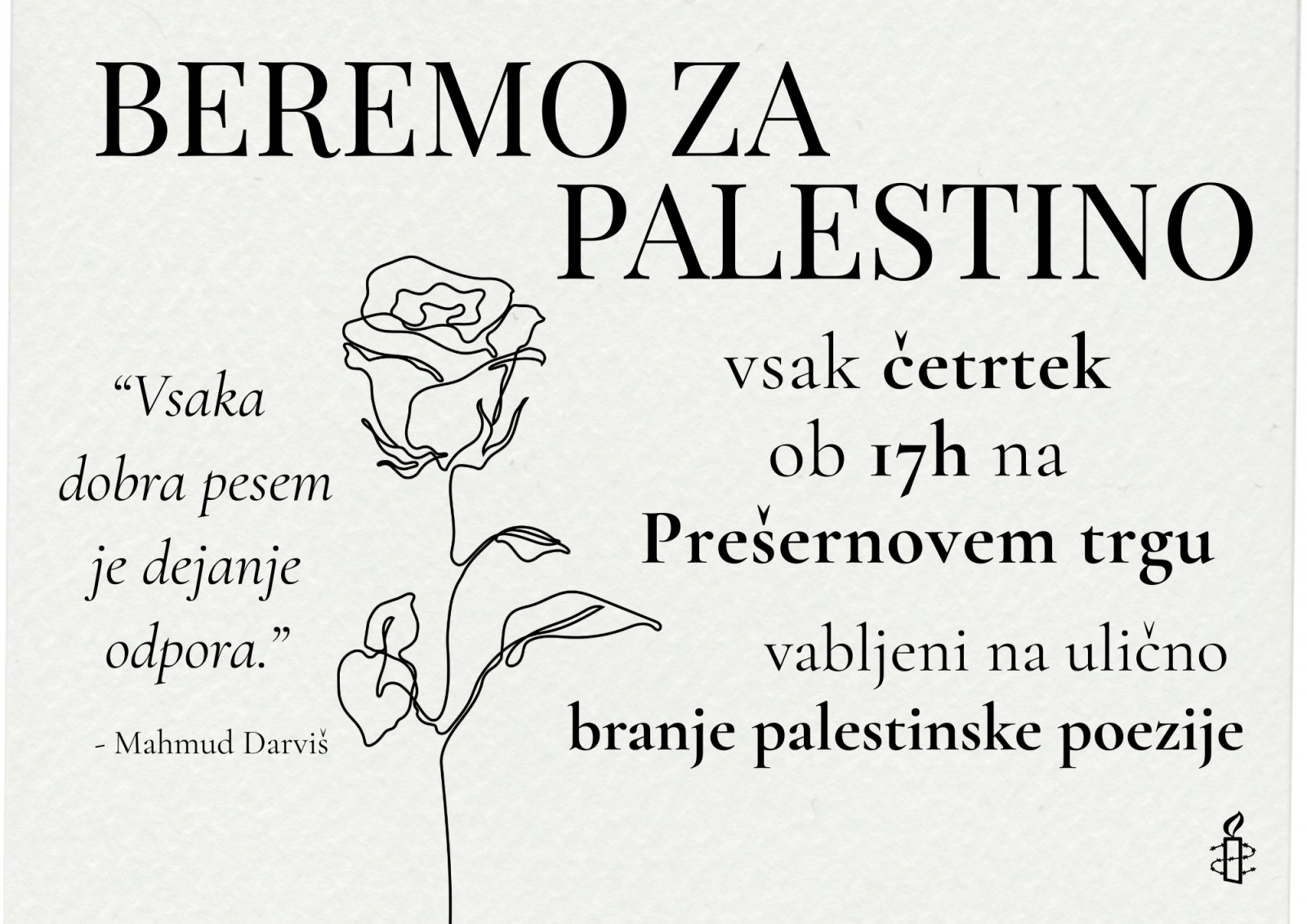 Tukaj (kliknite) najdete izbor nekaterih prevedenih pesmi sodobnih palestinskih avtoric in avtorjev, za še več prevodov in originalov pa lahko pišete ali na amnesty@amnesty.si ali Ani na anap321@proton.me.