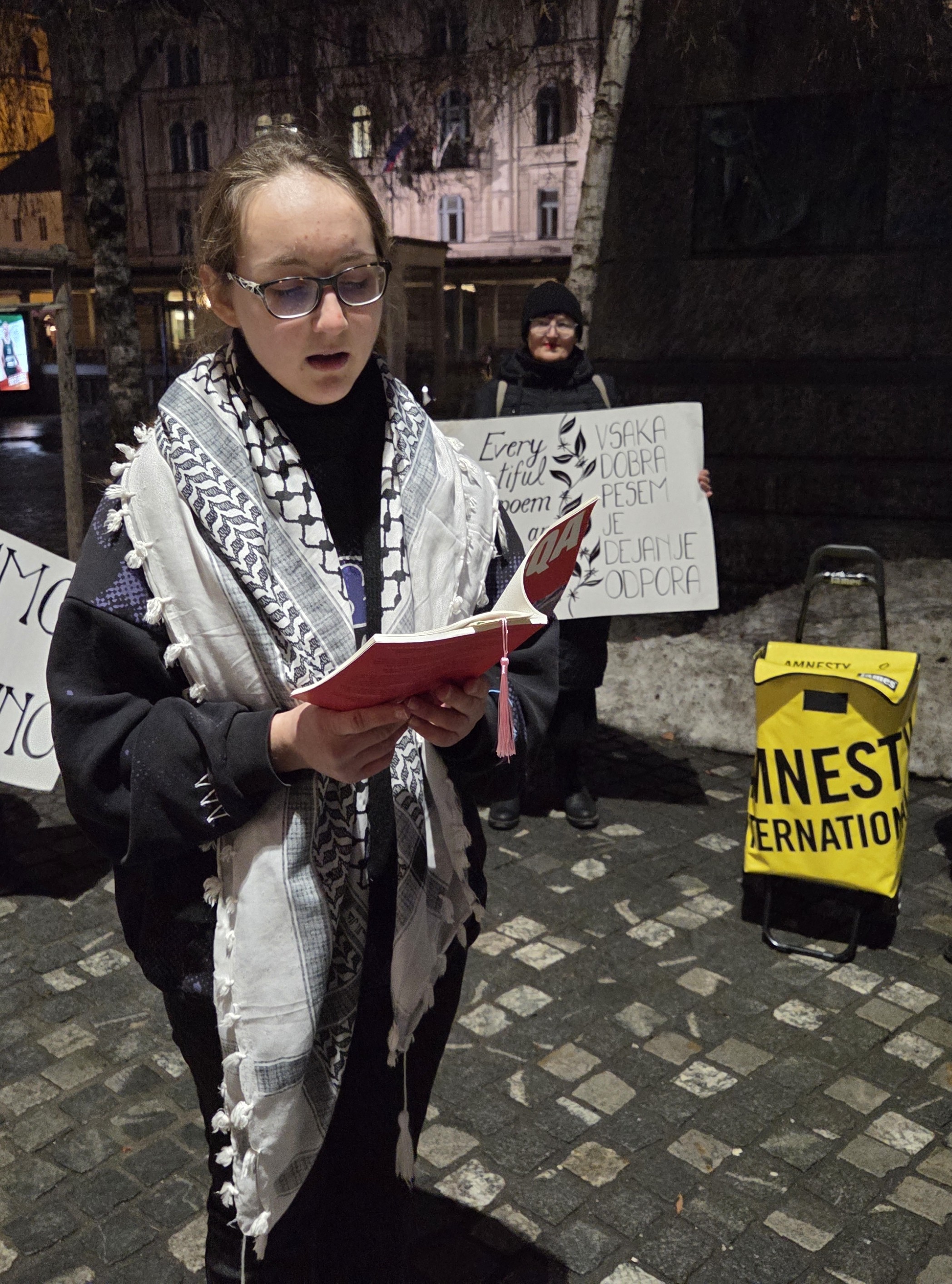 »Ideja uličnega branja palestinske poezije je vzniknila iz želje, da zmotimo navidezno normalnost mestnega življenja in opomnimo na dogajanje v Palestini in to na način, da svoje glasove podamo zatiranim ter omogočimo, da njihove zgodbe oživijo in odmevajo na mestnih ulicah,« pojasnjuje Ana, mlada aktivistka na fotografiji, ki od septembra 2025 koordinira branja palestinske poezije v Ljubljani na Prešernovem trgu. Kliknite tukaj za njen zapis.