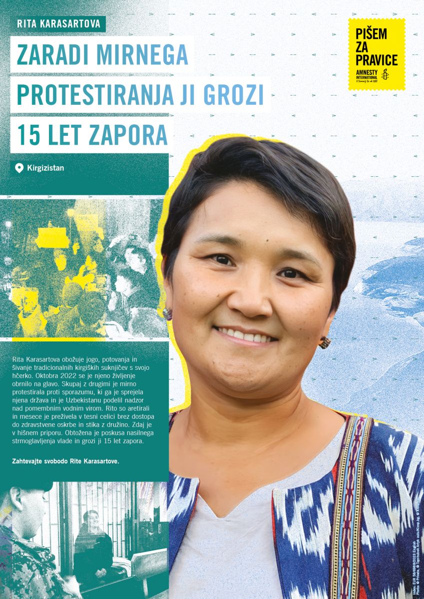 Rita Karasartova rada preživlja čas s svojimi otroki, vadi jogo in šiva chapanse – tradicionalne suknjiče v Kirgizistanu. Toda oktobra 2022 se je njeno življenje obrnilo na glavo. Bila je aretirana in mesece je preživela v tesni celici brez dostopa do zdravstvenega varstva in brez kontakta z družino. Zdaj je v hišnem priporu in držati se mora stroge policijske ure.