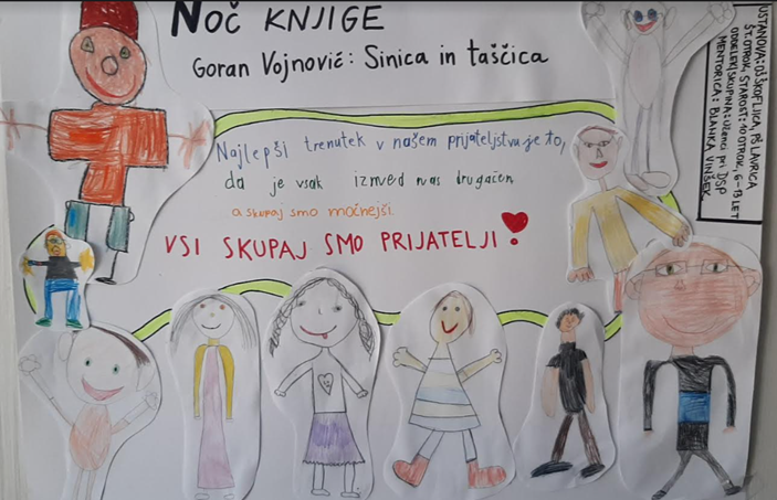 »20. aprila smo se ob 10.15 uri zbrali z učenci, ki obiskujejo dodatno strokovno pomoč, da bi skupaj prebrali knjigo Gorana Vojnovića: Sinica in Taščica. CILJI, ki sem jih z dogodkom želela doseči so: Približati knjige učencem; Predati učencem sporočilo o pomembnosti prijateljstva in kako dragocena je različnost med nami; Ustvariti plakat, ki bo prikazoval sporočilo slikanice. Skupaj z učenci smo se posedli v krog na blazinice, ki so bilje pripravljene v učilnici. Učencem sem prebrala knjigo. V krogu smo se pogovorili o vsebini knjige in o njenem sporočilu. Učenci so delili svoje izkušnje o prijateljstvu in medsebojni pomoči ter različnosti med nami. Opisali so, kako so pomagali drugim in kako so drugi pomagali njim, če so se znašli v težavah, opisali so dogodke in svoja občutenja ob tem, ko so pomoč nudili oziroma, ko so bili pomoči sami deležni. Skupaj smo ugotavljali, da je medsebojna pomoč izjemnega pomena ter kako naša različnost bogati naš svet ter kako je svet lažji, če si med seboj pomagamo. Ker smo želeli sporočilo knjige predati tudi ostalim učencem, smo izdelali plakat, ki ga bomo izobesili v šoli. Vsak izmed učencev je narisal svoj portret. Ugotovili smo, da je vsak izmed nas drugačen, a če sodelujemo drug z drugim in si med seboj pomagamo, si naredimo življenje lažje in lepše. Učenci so bili nad knjigo navdušeni, radi so poslušali zgodbo in pripovedovali o svojih izkušnjah. Z veseljem so sodelovali pri izdelavi plakata, še posebej jim je bilo všeč, ker bodo lahko s svojimi izdelki prispevali, k predaji pomembnega sporočila o medsebojni pomoči tudi ostalim učencem,« je zapisala mentorica projekta na OŠ Škofljica Blanka Vinšek.