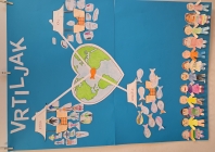 »Vrtiljak je naslov slikanice Tülin Kozikoglu, ki so jo letos izbrali v sklopu akcije Noč knjige na Amnesty International in nam jo tudi podarili. To je zgodba dveh otrok in njunih staršev, ki se na različnih koncih sveta, v različnih življenjskih okoliščinah, odpravljajo na pot, da bi se na koncu srečali na enakem vrtiljaku. Bralno potovanje odpira možnosti za pogovor o vojni in vzrokih za migracije ter privede do spoznanja, da vsi vstopamo na enak vrtiljak soodvisnosti in povezanosti sveta. Učenci so v šolski knjižnici skozi čuječnostni izziv ustvarili podobe drug drugega in simbolično vstopili na razredni vrtiljak. Skupni likovni izdelek je dopolnil razstavo ob mesecu knjige,« je zapisala knjižničarka Dragica Milojević.