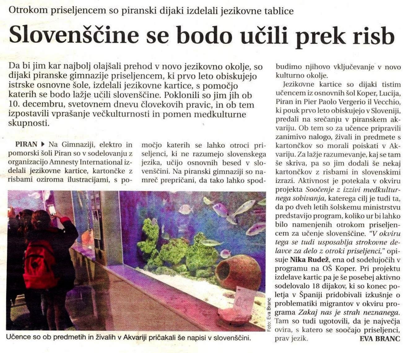 V Gimnaziji Piran so že tradicionalno sodelovali na maratonu pisanja apelov. Letos so se pridružili tudi izdelovanju jezikovnih kartic, ki pa so jih kar sami razdelili med otroke priseljence, ki letos prvič obiskujejo šole na Obali. Ob dnevu človekovih pravic so jim jih predali v Akvariju v Piranu ter zanje pripravili tudi zanimiv spremljajoči program. Več si lahko preberete na njihovi spletni strani, fotografije si lahko ogledate na njihovi strani na Facebooku, v galerijo dodali tudi članek, ki je bil objavljen v Primorskih novicah, na tej povezavi pa najdete tudi prispevek, ki je bil objavljen v dnevniku Televizije Slovenija.