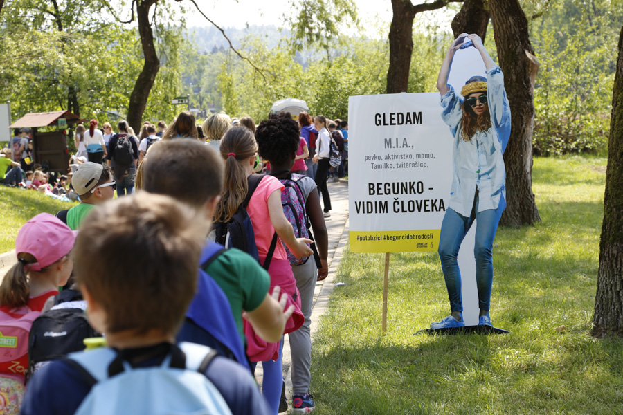 S sloganom Gledam begunca – vidim človeka smo opremili tudi naše cerade, ki smo jih obesili ob nekaj kontrolnih točkah ob poti. Pripravili smo tudi silhuete znanih ljudi, ki so bili begunci, a jih svet ne pozna po tem: Alberta Einsteina, Freddieja Mercurryja ter M.I.A..