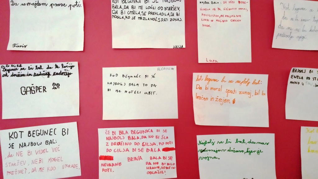 časopisne članke in prispevke s spletnih strani. Vživeli so se v vlogo begunca in opisali, česa bi jih bilo najbolj strah. Njihove izjave odražajo stiske otrok, ki to doživljajo na lastni koži.