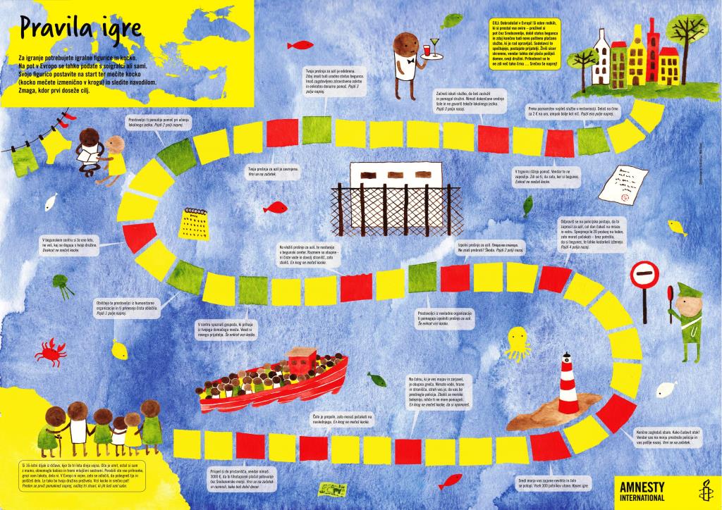 Da bi mladim lažje odgovorili na vprašanja in jim približali begunsko tematiko, smo natisnili didaktično namizno igro z informacijami o begunski tematiki (kliknite za elektronsko verzijo). Udeleženci se z metanjem kocke in premikanjem figurice po igralni plošči vživijo v vlogo mladostnika, ki se zaradi vojne poda na nevarno pot čez Sredozemlje v Evropo (pri tem lahko naletijo na različne ovire ali pomoč, ki jim olajša pot). Ta didaktični pripomoček lahko mladi uporabljajo samostojno, lahko pa vodeno v okviru npr. razredne ure.