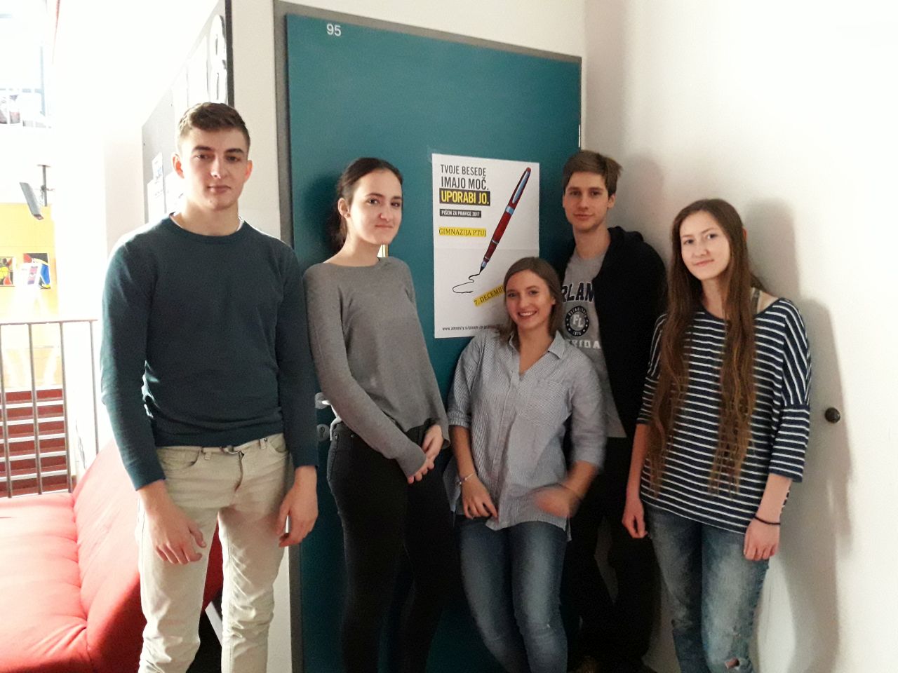 Tudi na ptujski gimnaziji so letos spet vihteli pisala. Takole je dogajanje na šoli povzel Jakob Štefan Štrucl iz 3. a: "December je in v tednu, ko razmišljamo o človekovih pravicah, spet izvajamo akcijo pisanja apelov za Amnesty International. V sodobni družbi so človekove pravice marsikje kršene, celo poteptane, toda dogajanja so skrita očem javnosti. Amnesty International prikaže življenjske zgodbe posameznikov, ki so želeli le izraziti svoje mnenje, zaščititi svoje bližnje ali svoje domove, pa so zato preganjani. 7. 12. 2017 smo dijaki 3. A vodili pisanje apelov, pridružili pa so se nam tudi dijaki 4. letnikov. Pisali smo tudi pisma podpore in podpisali peticijo na spletni strani AI. Naša pisma dosežejo ljudi in verjamemo, da jim pomenijo lučko upanja."