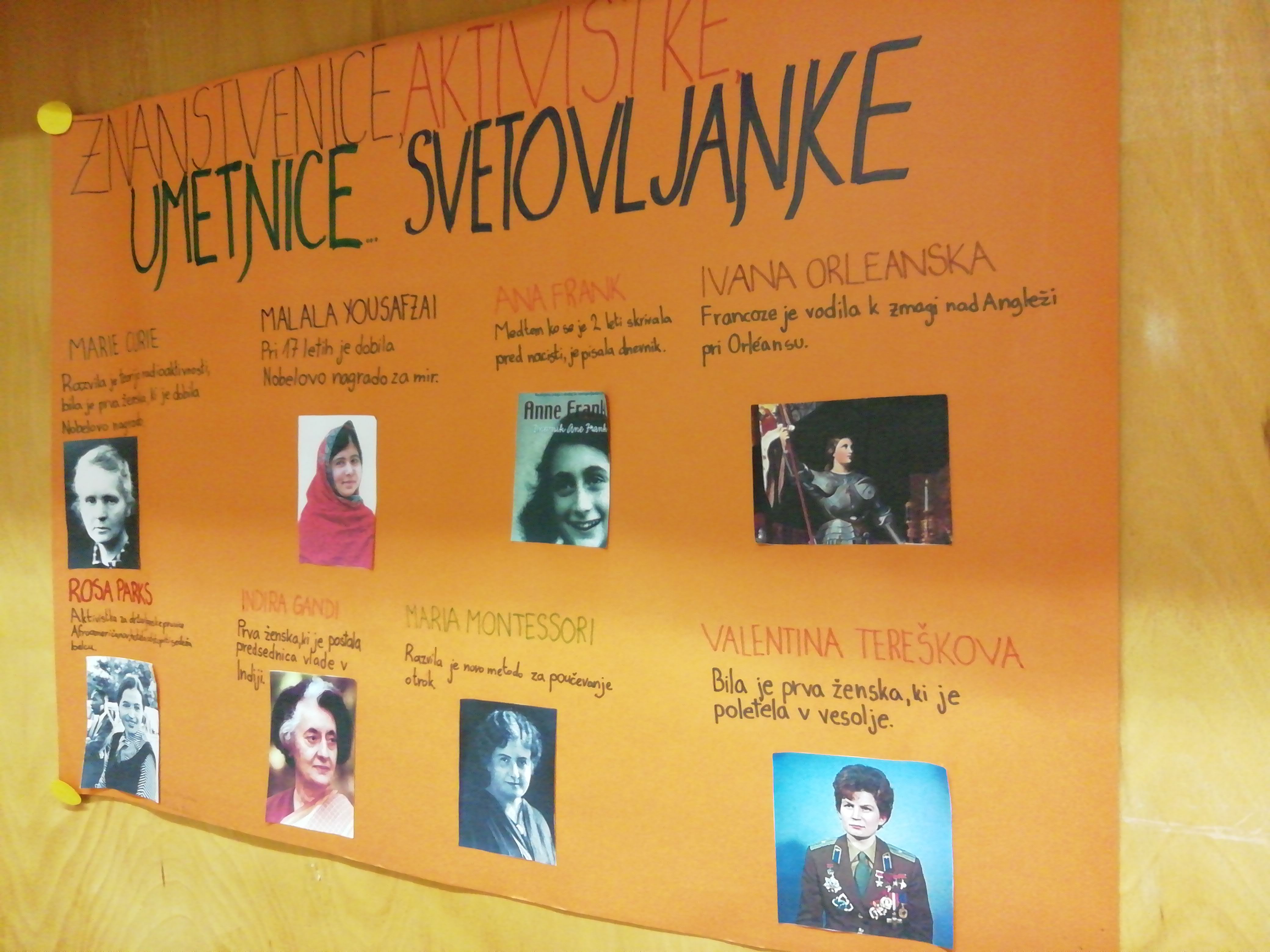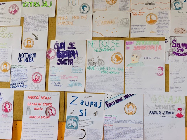 Učenke in učenci 7. a razreda OŠ Bršljin so v okviru predmeta DKE prebirali različno literaturo na temo žensk (Ženske - svetovljanke, Evropejke, Slovenke, Novomeščanke, Bršljinčanke), se pogovarjali, oblikovali zapise, poročali in predstavili svoje izdelke na šolski razstavi. Dunja Bukovec je o bogatem programu in delu skupin na Noči knjige zapisala: "Skupina, ki je predstavila temo Ženske v številkah, je s pomočjo publikacije Statističnega urada Slovenije izvedela, da ženske v povprečju zaslužijo manj kot moški, da sta najpogostejši imeni žensk v Sloveniji Marija in Ana, da jih je na vodilnih mestih manj kot moških, da živijo dlje in da je v povprečju več diplomantk kot diplomantov. Skupina, ki je oblikovala plakat na temo Znanstvenice, aktivistke, umetnice, svetovljanke je izbrala osem žensk ter v besedi in sliki kratko predstavila njihovo izjemnost in pogum. Zanimivi so bili tudi plakati, kjer so dekleta predstavila pogumne, odločne in uspešne Slovenke. Odločile so se za predstavitev Dese Muck, Svetlane Makarovič, Tanje Ribič in Alme Karlin. Fantje pa so predstavili znane Novomeščanke: Ilko Vašte, Pio Mlakar, Rio Bačer, Stašo Vovk. Zaključni predstavitvi je sledila postavitev razstave in pogovor o pogumnih, izjemnih dekletih v razredu in na naši šoli. Verjamemo, da bodo nekoč tudi one spreminjale svet."