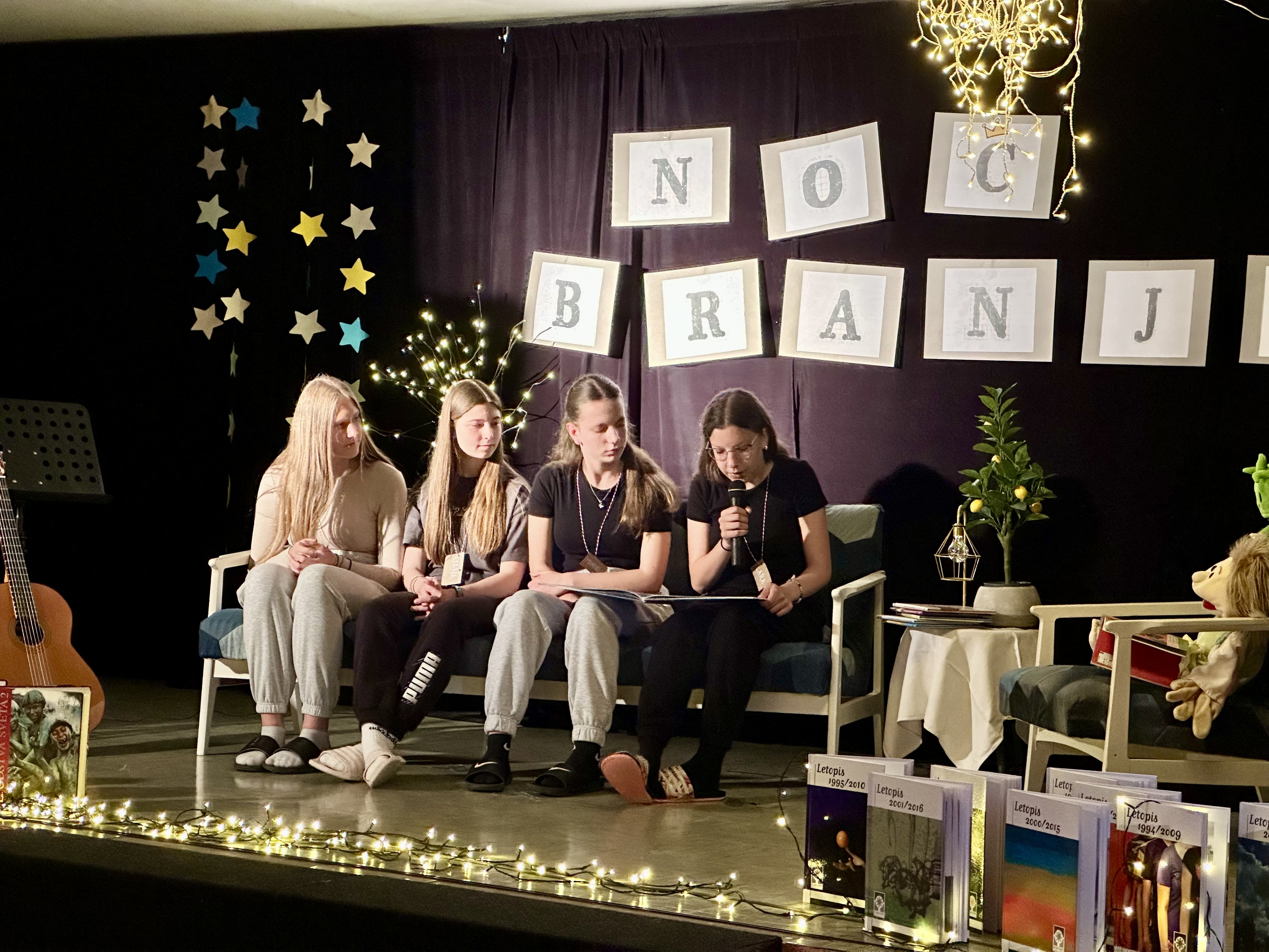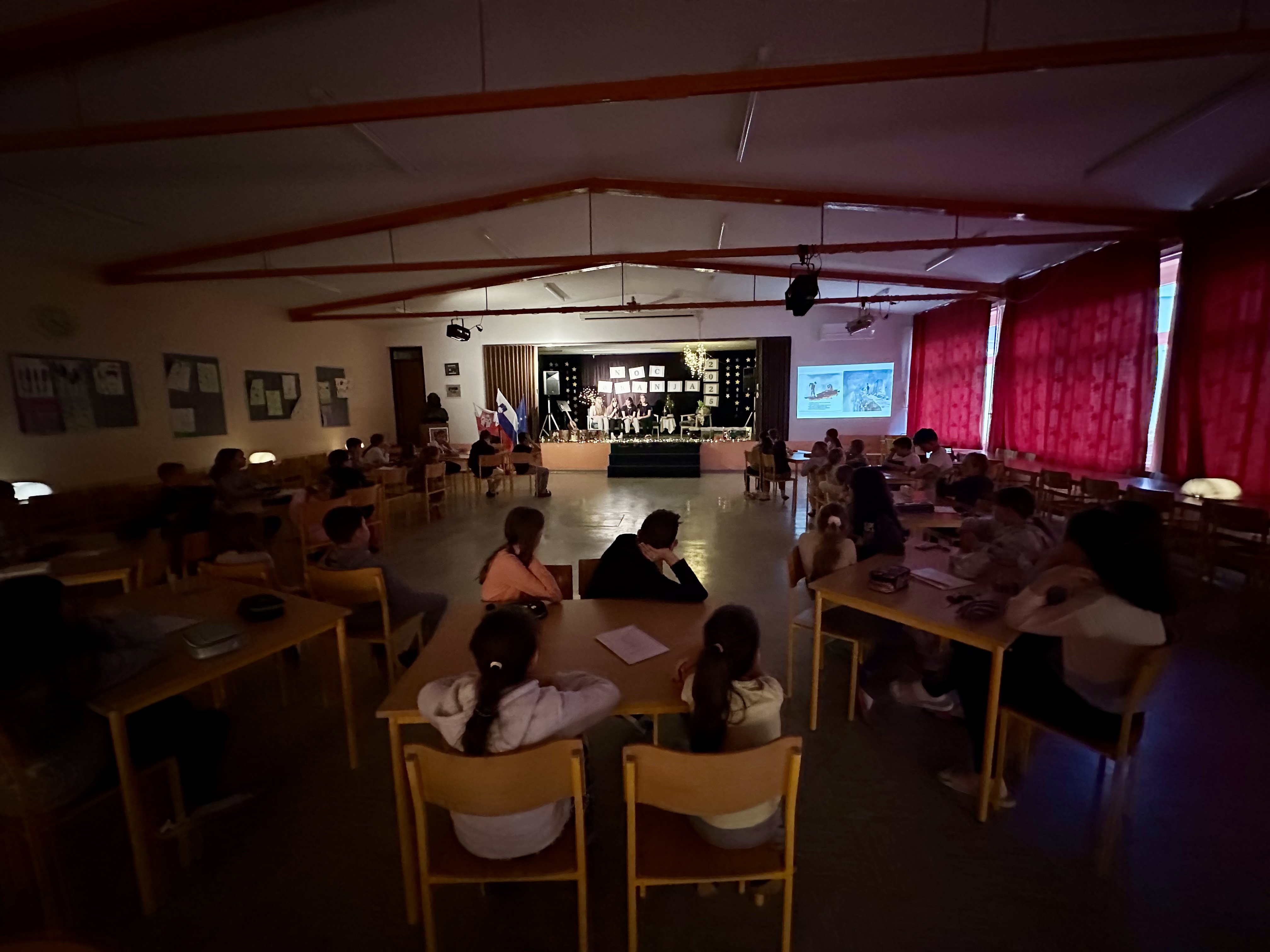 »Letošnja noč branja je potekala v petek 17. 4. 2025. Pričela se je ob 18.00 z astronomsko delavnico, izdelovanjem zapestnic in z glasbeno delavnico, ki sta jo vodili glasbenici Eva Hren Fras in Rebeka Hren Dragolič. Z navdušenjem smo se odpravili na lov za zakladom, ki smo ga našli v knjižnici, ko smo rešili vse uganke.Sledil je nastop učencev iz glasbene delavnice. Deset učencev je dve ljudski pesmi poustvarila s petjem in igranjem violine, viole, oboe, kitare in prečne flavte. Posnetek nastopa si lahko ogledate na spodnji povezavi: https://video.arnes.si/watch/q3k2wmn3zn73 Po večerji smo dokončali zapestnice in si ogledali film Ledena doba. Preselili smo se v veliko telovadnico, si pripravili udobna ležišča in začeli brati. Nekateri so kmalu zaspali, eni pa šele proti jutru. Vsi pa smo se zjutraj zbudili dobre volje, pojedli zajtrk, pospravili in odšli domov. Na izhodu pa nas je pričakalo še darilo presenečenja,« so zapisali učenci knjižničarskega krožka z mentorico Suzano Klemenčič