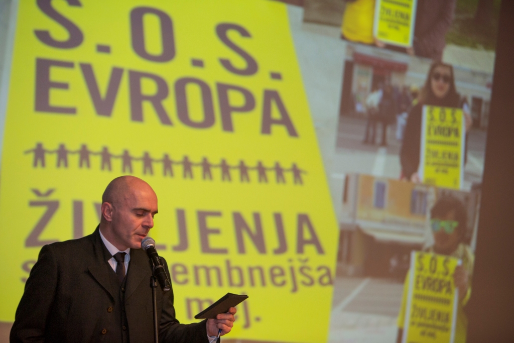 Najboljši kratki dokumentarni film na temo migrantov sta razglasila člana žirije Tina Plahutnik (na sredini) in Miha Hočevar (levo). (Foto: Tanja Ristič)