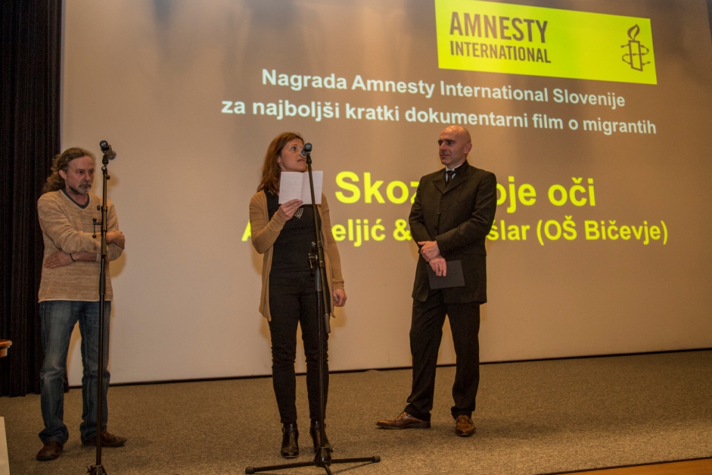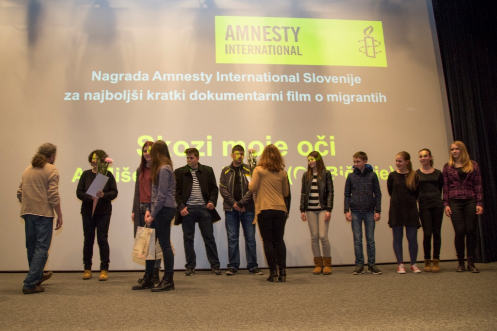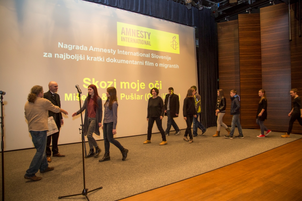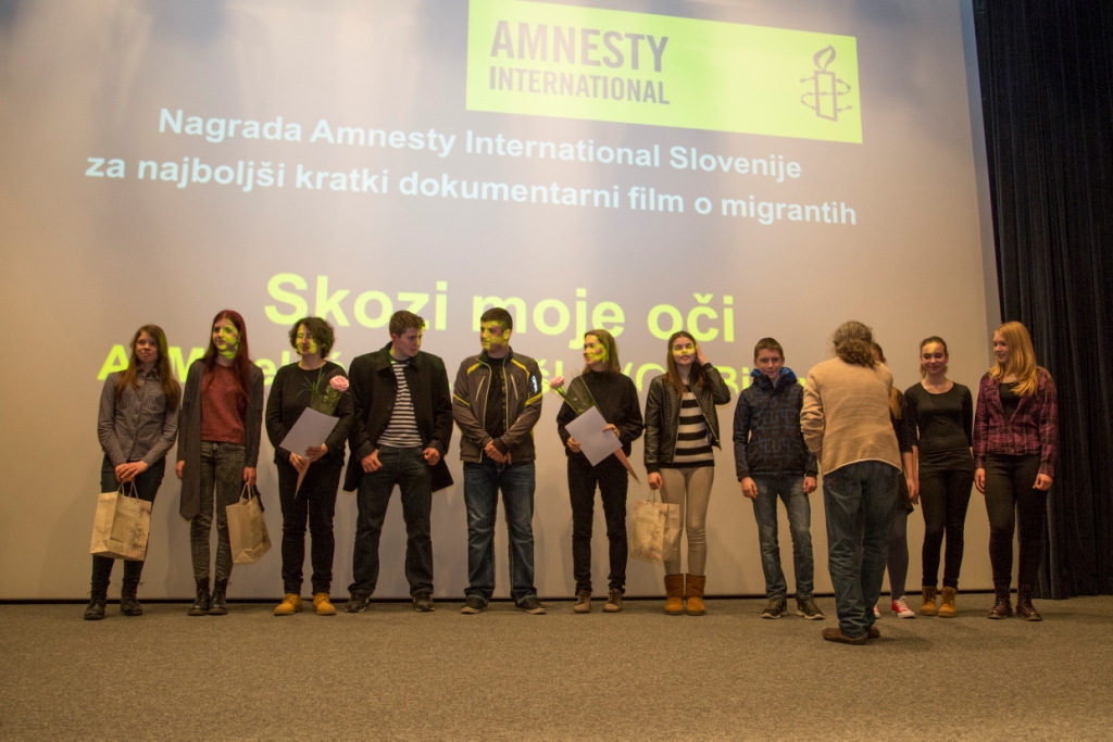 S sklepno prireditvijo se je zaključil 17. Festival dokumentarnega filma, kjer je Amnesty International tradicionalno podelila nagrado za najboljši dokumentarni film na temo človekovih pravic (zmagovalec: Goli otok, posebna omemba: Biti Iranec), drugo leto zapored pa smo nagradili tudi mlade ustvarjalce. Žirija, ki so jo sestavljali pisateljica Desa Muck, Tina Plahutnik z OŠ Frana Albrehta in režiser Miha Hočevar, je za najboljši kratki dokumentarni film o migrantih izbrala Skozi moje oči. Filmček sta posneli Anabela Mišeljić in Nika Pušlar, pomagali pa so jima sošolke in sošolci z OŠ Bičevje in mentorici Bernarda Avsenik in Alenka Fajfar Gnezda.