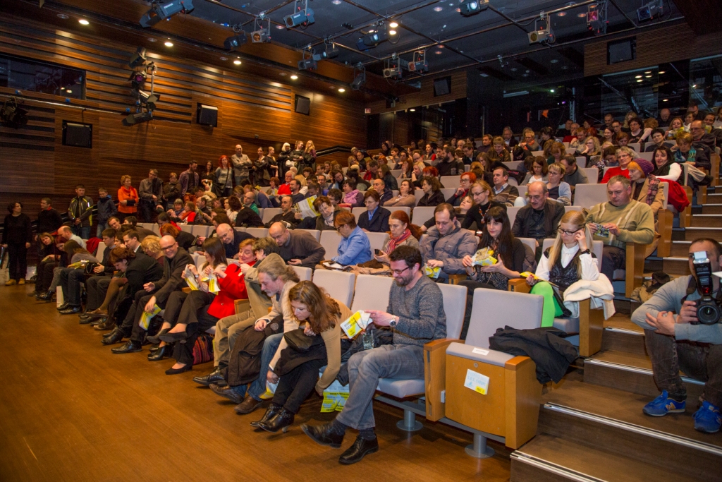 Prireditev smo zaključili po naše - aktivistično! :) Povezovalec je obiskovalke in obiskovalce prosil, naj sežejo pod svoj sedež ... (Foto: Tanja Ristič)