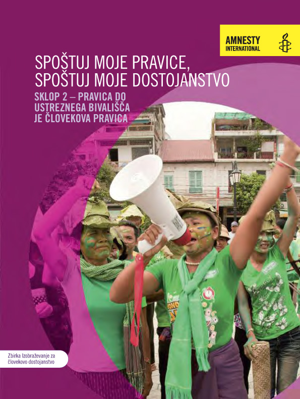 Sklop 2 - Pravica do ustreznega bivališča je človekova pravica Ideal, zapisan v Splošni deklaraciji človekovih pravic, da se vsi rodimo svobodni in imamo enako dostojanstvo in enake pravice, še zdaleč ni postal globalna resničnost. Milijonom ljudi po vsem svetu, ki živijo v neustreznih bivališčih, je bilo dostojanstvo odvzeto. Ta učni pripomoček želi mladim in tistim, ki z njimi delajo, omogočiti razumevanje pravice do ustreznega bivališča kot človekove pravice. Skozi številne aktivnosti jih vzpodbuja, da uporabijo svoj glas za zahtevanje svojih pravic in za ukrepanje v zadevah, ki so jim pomembne. Lahko služi za sodelovanje v kampanji Amnesty International Zahtevamo dostojanstvo, ki se osredotoča na ljudi, ki živijo v revščini, in jim pomaga, da zahtevajo in uveljavljajo svoje pravice. Lahko pa se ga uporabi tudi v okviru drugih izobraževalnih dejavnosti, ki naslavljajo pravico do ustreznega bivališča v okviru človekovih pravic. To je drugi izobraževalni sklop iz zbirke Izobraževanje za človekovo dostojanstvo. Vsak sklop predstavlja druge teme, vezane na revščino in človekove pravice. Ta sklop se osredotoča na pravico do ustreznega bivališča. |