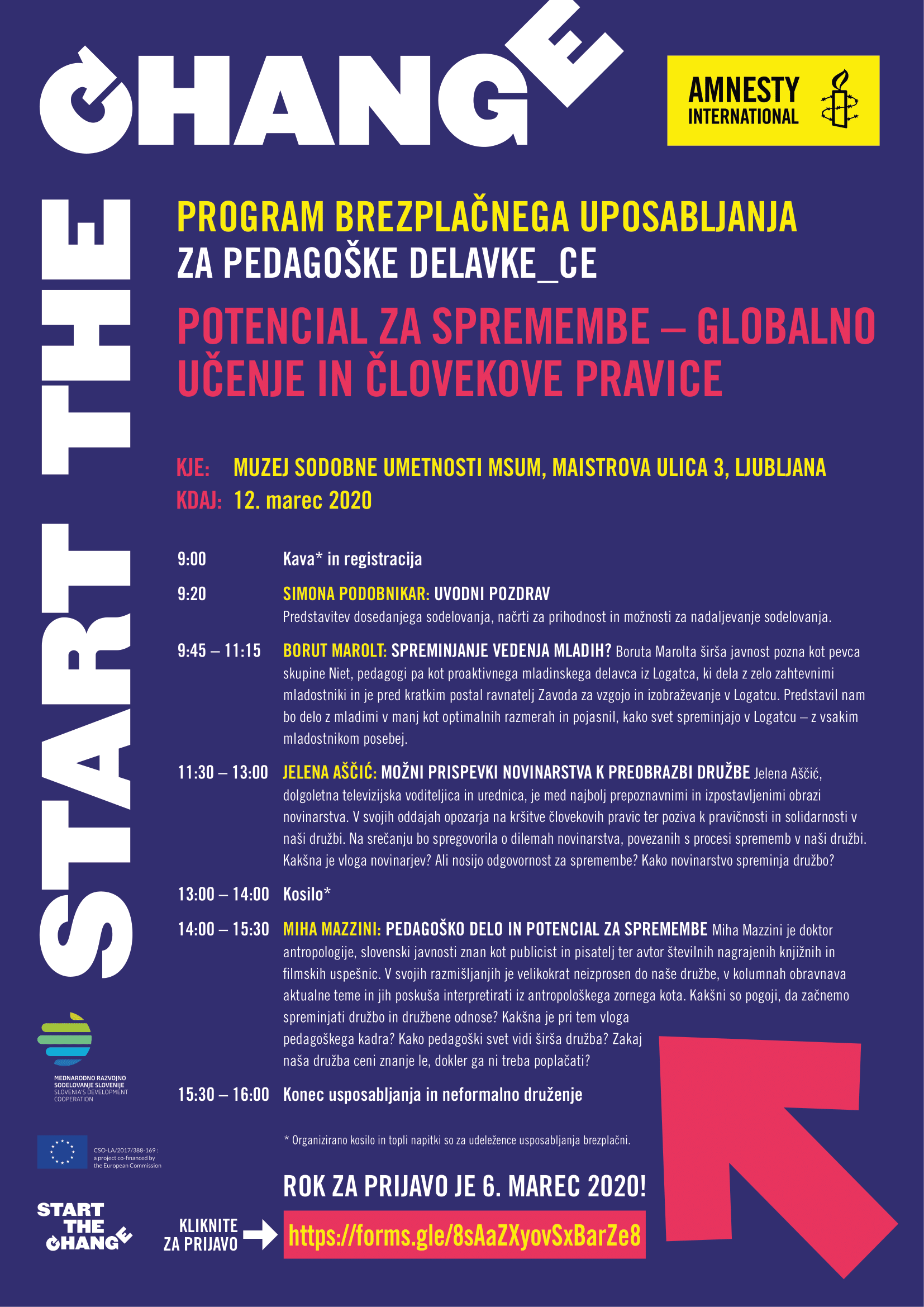 Toplo vas vabimo na brezplačno usposabljanje, ki ga v okviru projekta Start the Change organiziramo 12. marca 2020 v MSUM na Maistrovi ulici 3 v Ljubljani.