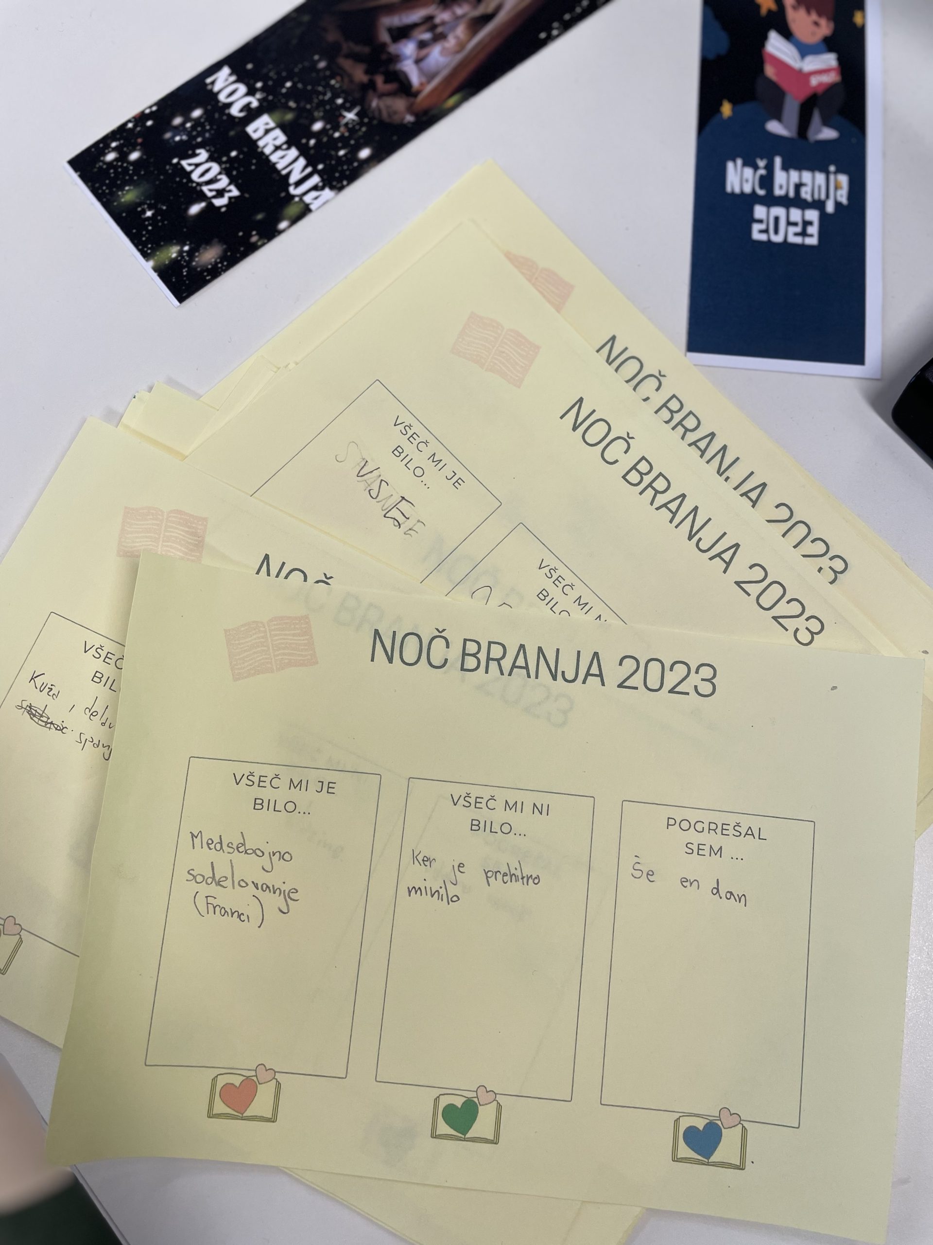 »Za učence od 6. do 9. razreda smo v petek, 21. 4. 2023, prvič pripravili pravo Noč branja, ki so se je udeležili učenci od 6. do 9. razreda, ki so v letošnjem šol. letu opravili bralno značko. Noči branja se je udeležilo 15 učencev od 6. do 9. razreda. Potekala je od 18. do 22. ure v prostorih naše šole. Z »Nočjo knjige« smo tako obeležili svetovni dan knjige, ki ga praznujemo 23. aprila, ko po vsem svetu potekajo različne aktivnosti v okviru »Noči knjige«. Na tak način smo se pridružili mladim po vsem svetu, ki v šolah, knjižnicah in kulturnih ustanovah skupaj berejo in ustvarjajo, predvsem pa uživajo v svetu knjig in v druženju z vrstniki. V sodelovanju z organizacijo za človekove pravice