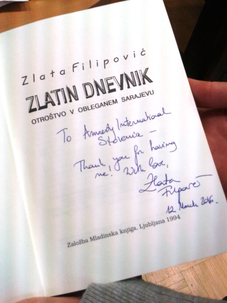 V Sloveniji se je te dni mudila Zlata Filipović, avtorica Zlatinega dnevnika, ki smo jo k nam povabili kot žirantko na 18. Festivalu dokumentarnega filma. Kljub zelo polnemu urniku in bolezni (imela je zelo visoko temperaturo) si je vzela čas tudi za mlade.